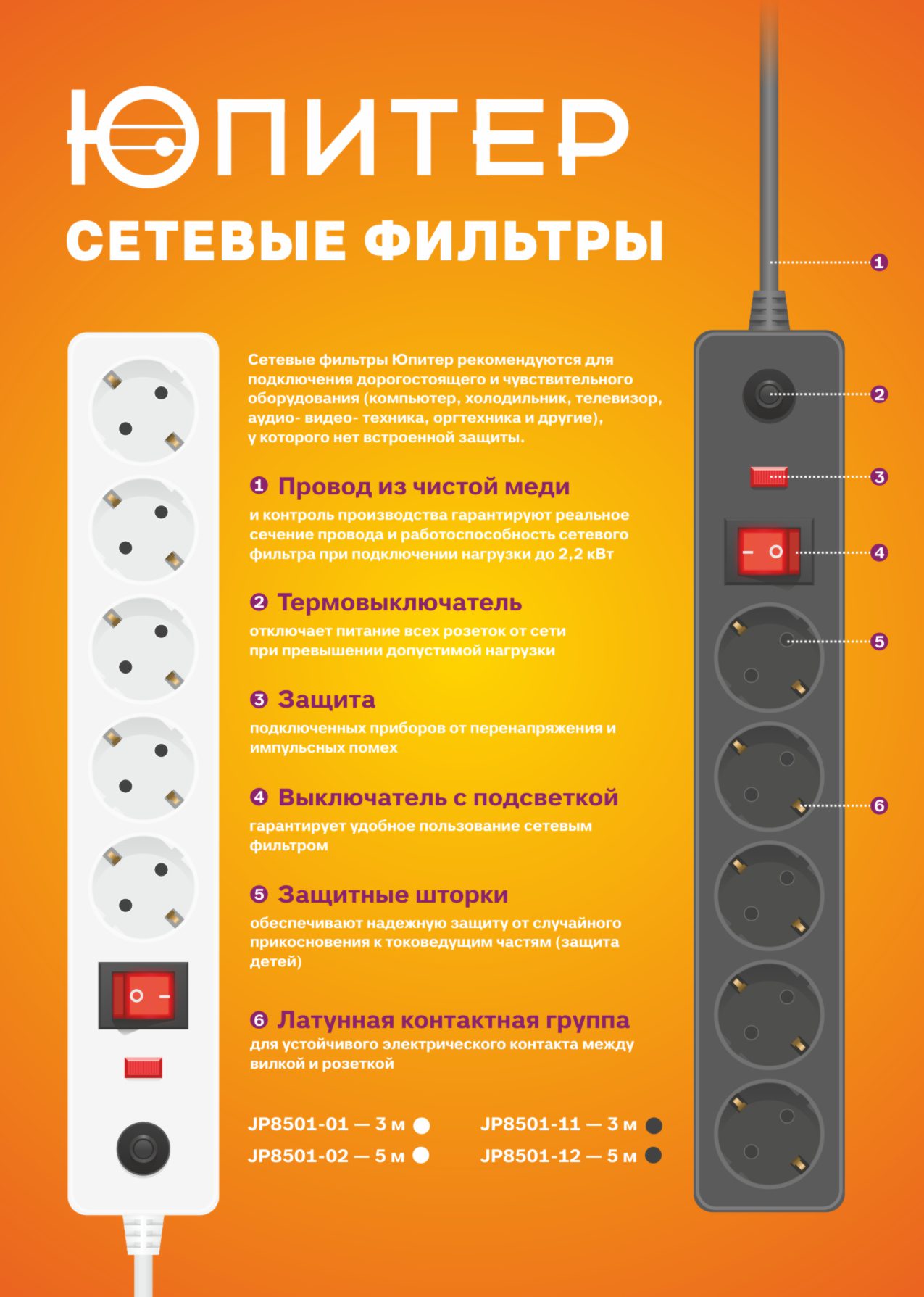 Сетевой фильтр 5 м 5 розеток 2,2 кВт белый ЮПИТЕР (JP8501-02) изготовлен только из качественных материалов в соответствии с ГОСТ60884-1 и рекомендуется для подключения дорогостоящего и чувствительного оборудования (компьютер, холодильник, телевизор, аудио- видео- техника, оргтехника и др.), у которого нет встроенной защиты. Встроенные элементы обеспечивают надежную защиту подключенных приборов от перенапряжения и импульсных помех. Термовыключатель отключает питание всех розеток от сети при превышении допустимой нагрузки.Провод из чистой меди и контроль производства гарантируют реальное сечение провода и работоспособность удлинителя при подключении нагрузки до 2200Вт. Латунная контактная группа для устойчивого электрического контакта между вилкой и розеткой. Выключатель имеет световую индикацию наличия напряжения в сети, а также позволяет одновременно отключить все подключенные приборы. Защитные шторки открываются нажатием только на две одновременно, что обеспечивает надежную защиту от случайного прикосновения к токоведущим частям (защита детей).