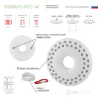 Светодиодный кемпинговый фонарь в футуристичном дизайне, специально разработанном компанией ЭРА. Фонарь предназначен для активного отдыха, отдыха на природе, для пикников, дачи. Дизайн фонаря функционален. 48 мощных светодиодов расположены по кругу таким образом, чтобы освещать максимально большую площадь ярким белым. Светодиоды энергоэкономичны, не перегорают и не требуют замены. Посередине фонаря предусмотрено отверстие, если надеть фонарь на любую подставку, например, на бутылку, получится настольный светильник. Фонарь оснащён мощным магнитом, так что его легко приклеить к металлической поверхности. Корпус выполнен из ударопрочного пластика и защищает от царапин и механических повреждений, а светодиоды встроены внутрь корпуса, что обеспечивает им дополнительную защиту. Дальность луча фонаря составляет 21 метр, мощность — 3,3Вт. Фонарь питается от 3 батареек АА. Это позволило сделать фонарь портативным и лёгким, но в тоже время надёжным. Фонарь комплектуется кронштейном для подвешивания. Фонарь можно использовать не только в походах, но и в любых ситуациях, когда необходим яркий дополнительный источник света.