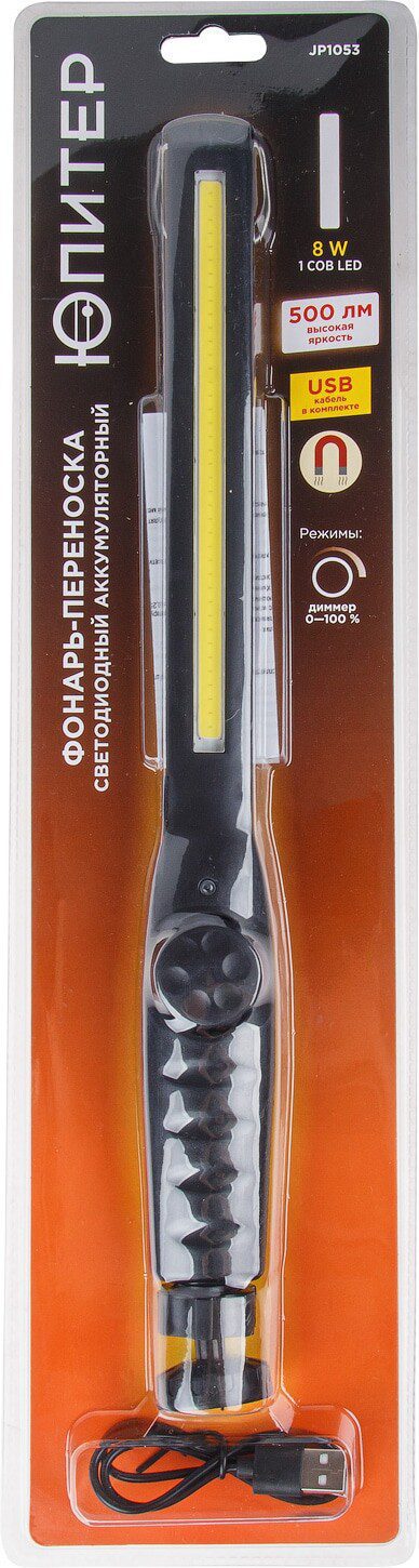 Фонарь-переноска светодиодный аккумуляторный 8 Вт ЮПИТЕР (JP1053) с эргономичным корпусом и ярким рассеянным светом станут незаменимым помощником любому автомеханику. Магнит поможет зафиксировать фонарь на металлической (магнитной) поверхности, а подвес – зафиксировать фонарь в иных ситуациях.Удобно заряжать благодаря USB кабелю в комплекте. Режимы работы: диммер 0-100%