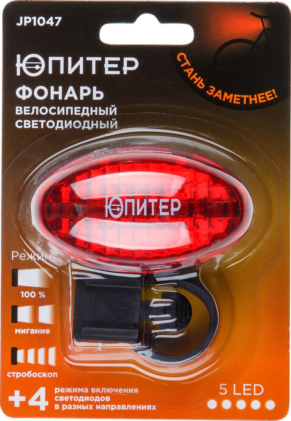 Фонарь велосипедный светодиодный 5LED 2xAAА ЮПИТЕР (JP1047) отличается высоким качеством, практичностью и приемлемой ценой. Предназначен для обозначения велосипеда в темное время суток. В комплекте поставляется удобное крепление к велосипеду. Режимы работы 100% яркости, стробоскоп (частое мигание), мигание, 4-7 режимы – поочередное загорание светодиодов в разных последовательностях. Источник питания 2хAAA (элементы питания в комплект не входят).