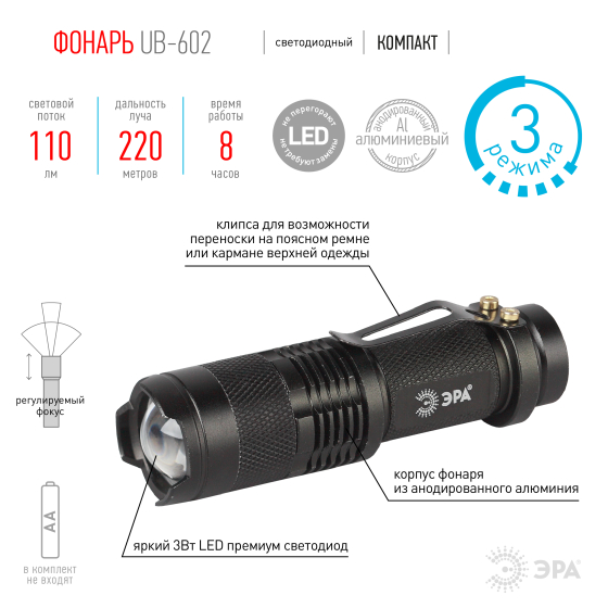 Фонарь UB-602  ЭРА универсальный “Компакт” [3 Вт, 1xAA, алюм, регул. фокус, 3 режима, прищепка, бл]