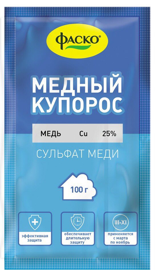 Фунгицид ФАСКО Медный купорос 100 г для профилактики и лечения болезней (парши, монилиоза, антракноза и др.) растений, борьбы с насекомыми-вредителями и дезинфекции ран. Для плодово-ягодных, декоративных деревьев и кустарников.