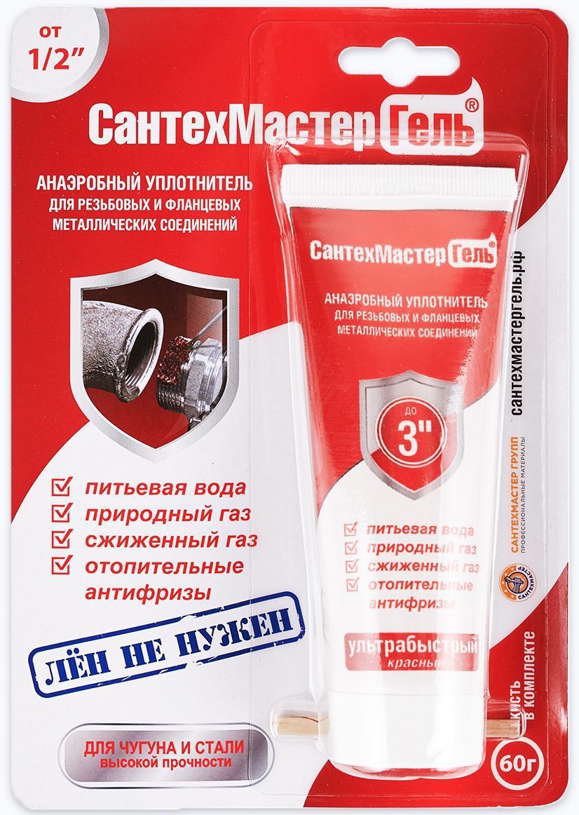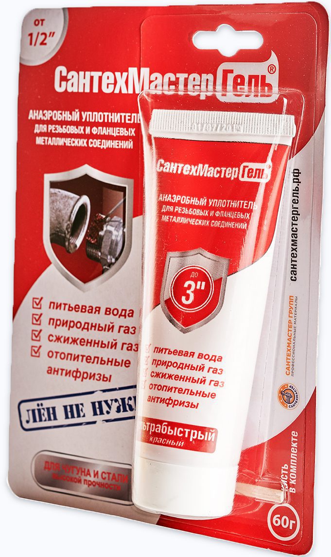 СантехМастер Гель Зеленый — это резьбовой герметик для сантехники, разработан для простого и быстрого монтажа и демонтажа соединений, которые располагаются в труднодоступных местах, и где тяжело уплотнять резьбу чем-либо еще. Он создан для удобной герметизации металлических резьбовых и фланцевых соединений на трубах диаметром до 1,5 дюймов и справляется с этим отлично, благодаря быстрой скорости окончательной полимеризации. Этот анаэробный герметик для резьбовых соединений остается герметичным даже при работе с агрессивными средами: горячая вода под большим давлением, природный и сжиженный газ, топливо (бензин, солярка), антифриз, ацетон, спирт, фреон, масла, тормозная жидкость. СантехМастер Гель Зеленый заканчивает полимеризацию в течении нескольких минут, для этого процесса достаточно комнатной температуры и плотного контакта с металлом. Воздух для реакции не требуется. На сегодняшний день – это лучший резьбовой герметик для труб, который обладает отличной сцепкой с металлическими поверхностями и выдерживает любое разрушительное воздействие: перепады широкого диапазона температур, высокое давление, механические повреждения, вибрации. Встряхните тюбик. На сухую, чистую и предварительно обезжиренную резьбу нанесите анаэробный гель-герметик непрерывным толстым слоем (в случае сильного загрязнения или ржавления резьбы, зачистите её поверхность металлической щёткой). Соберите соединение. Излишки состава, выдавленные при сборке, перенесите на следующую резьбу. Для нанесения состава и переноса излишков можно использовать стержень из фибергласа, который поставляется в комплекте с гелем. Предварительно обожгите стержень с одного из концов на открытом пламени и разомните о твёрдую поверхность для образования щетины. Диапазон рабочих температур от -60 до +150°C.