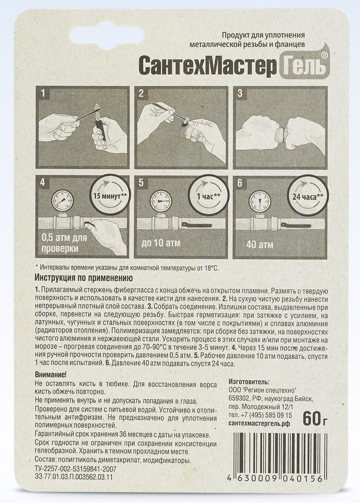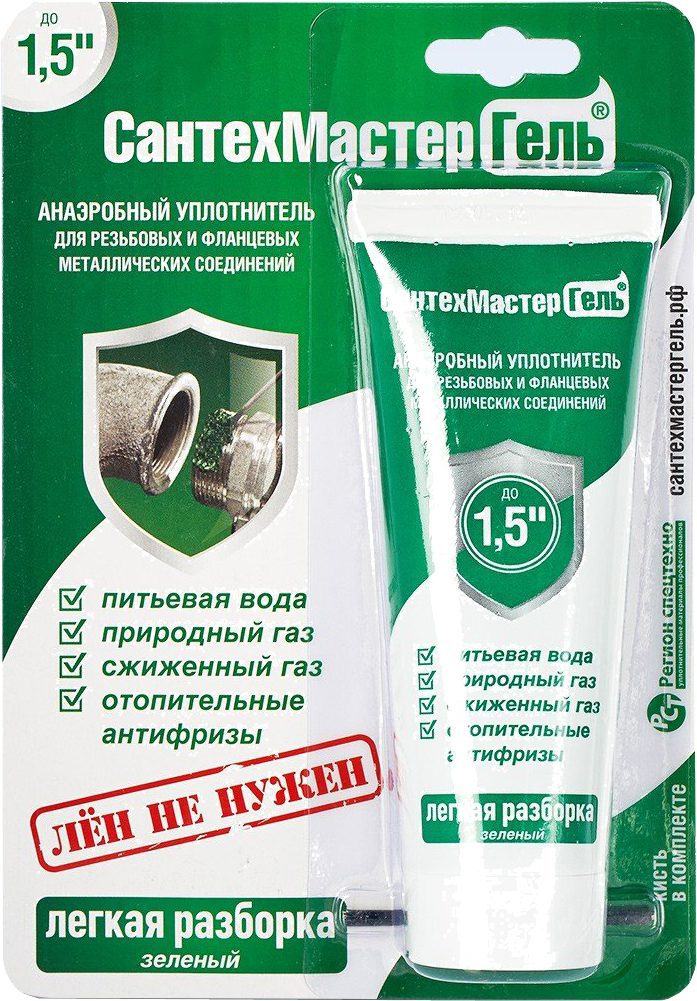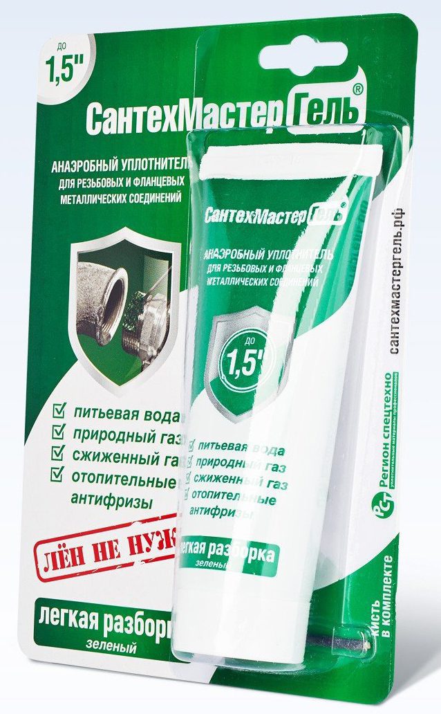 СантехМастер Гель Зеленый — это резьбовой герметик для сантехники, разработан для простого и быстрого монтажа и демонтажа соединений, которые располагаются в труднодоступных местах, и где тяжело уплотнять резьбу чем-либо еще. Он создан для удобной герметизации металлических резьбовых и фланцевых соединений на трубах диаметром до 1,5 дюймов и справляется с этим отлично, благодаря быстрой скорости окончательной полимеризации. Этот анаэробный герметик для резьбовых соединений остается герметичным даже при работе с агрессивными средами: горячая вода под большим давлением, природный и сжиженный газ, топливо (бензин, солярка), антифриз, ацетон, спирт, фреон, масла, тормозная жидкость. СантехМастер Гель Зеленый заканчивает полимеризацию в течении нескольких минут, для этого процесса достаточно комнатной температуры и плотного контакта с металлом. Воздух для реакции не требуется. На сегодняшний день – это лучший резьбовой герметик для труб, который обладает отличной сцепкой с металлическими поверхностями и выдерживает любое разрушительное воздействие: перепады широкого диапазона температур, высокое давление, механические повреждения, вибрации. Встряхните тюбик. На сухую, чистую и предварительно обезжиренную резьбу нанесите анаэробный гель-герметик непрерывным толстым слоем (в случае сильного загрязнения или ржавления резьбы, зачистите её поверхность металлической щёткой). Соберите соединение. Излишки состава, выдавленные при сборке, перенесите на следующую резьбу. Для нанесения состава и переноса излишков можно использовать стержень из фибергласа, который поставляется в комплекте с гелем. Предварительно обожгите стержень с одного из концов на открытом пламени и разомните о твёрдую поверхность для образования щетины. Диапазон рабочих температур от -60 до +150°C.