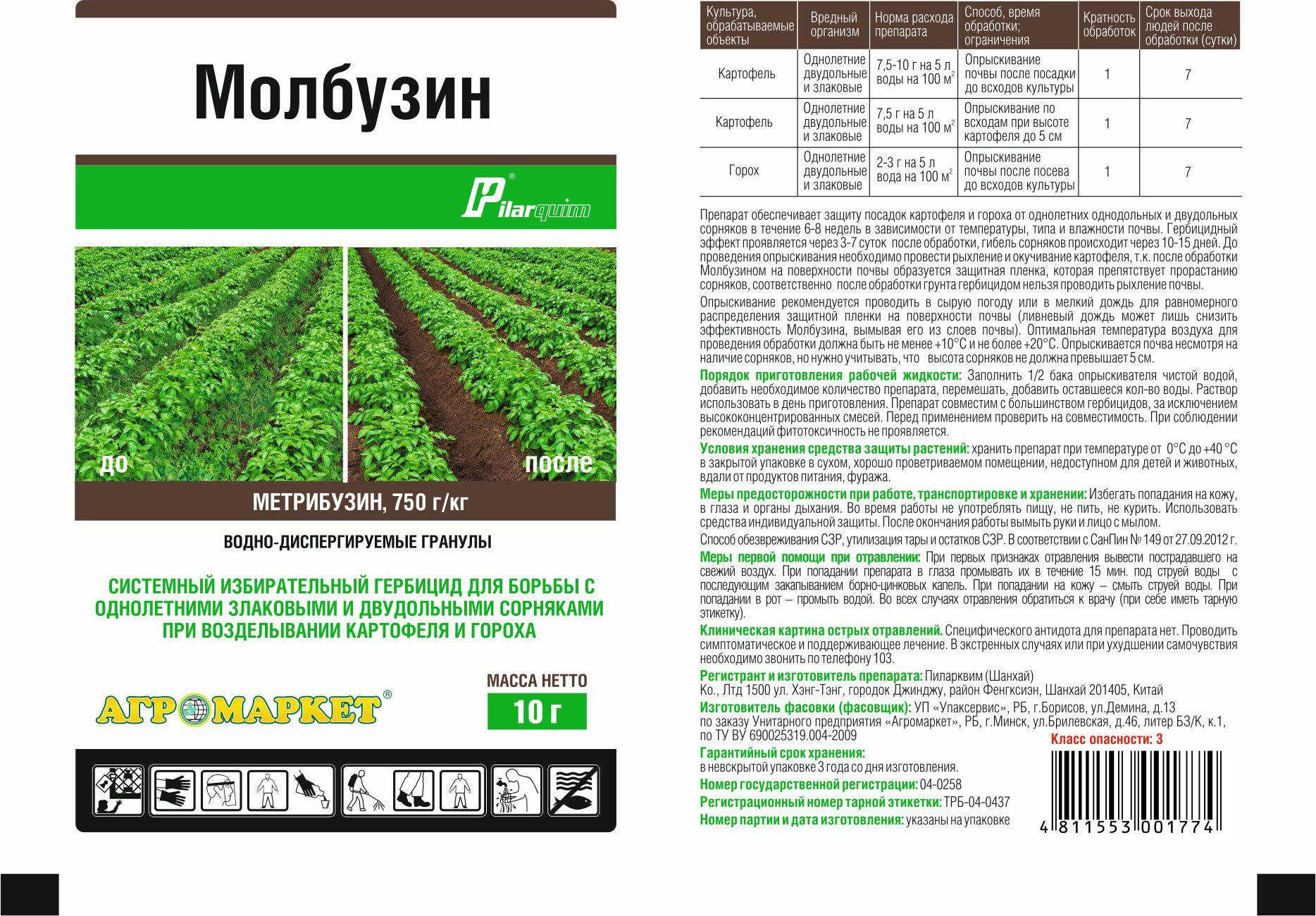 Гербицид Молбузин АГРОМАРКЕТ 10 г (16697) – это системный изберательный гербицид широкого спектра действия. Предназначен для борьбы с однолетними злаковыми и двудольными сорняками при возделывании картофеля и гороха. Применяется до и после всходов картофеля и до всходов гороха, независимо от фазы развития сорняков. После обработки препаратом рыхление почвы (окучивание) проводить через 3 недели.