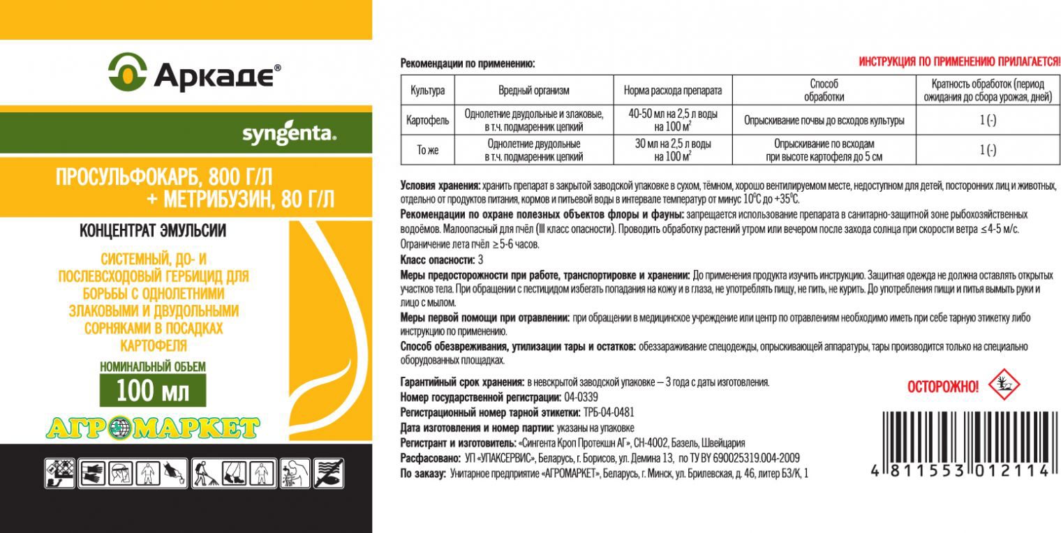 Гербицид Аркадэ КЭ АГРОМАРКЕТ 100 мл (30801) – это системный, до- и послевсходовый гербицид для борьбы с однолетними и двудольными сорняками в посадках картофеля.