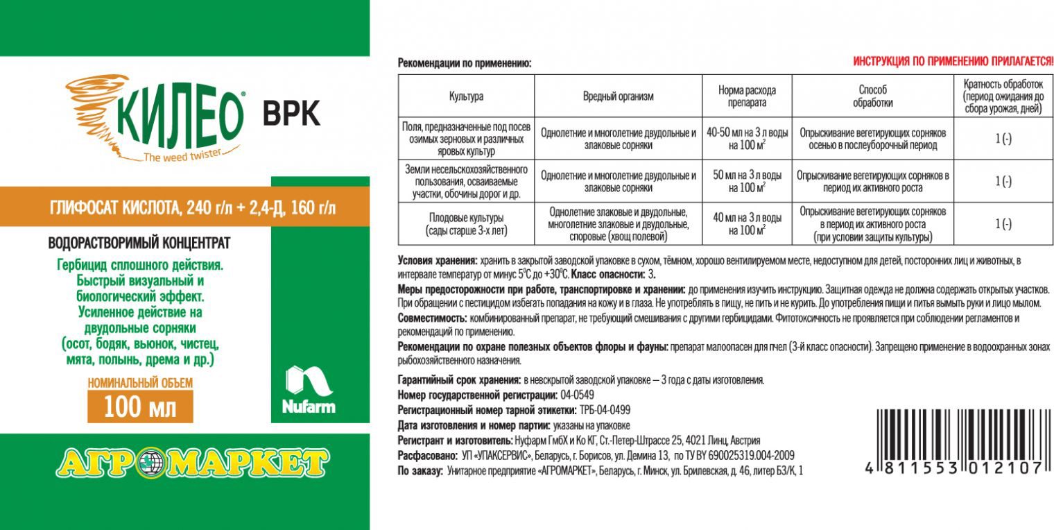 Гербицид Килео ВРК АГРОМАРКЕТ 100 мл сплошного действия с уникальной скоростью и эффективностью действия для самых требовательных агрономов.Преимущества: Впервые создана стабильная препаративная форма глифосат + 2,4-Д, сочетающая выгоды их совместного использования благодаря ярко выраженному эффекту синергизма.Усиленное действие на двудольные сорняки (на 20% и более), в т.ч. трудноискоренимые обычным глифосатом (осот, бодяк, вьюнок, чистец, дрема, мята, полынь и др.).Добавление к глифосату 2,4-Д усиливает действие также на злаковые сорные растения вследствие увеличения на 10% проникновения глифо- сата в лист.Быстрый визуальный и биологический эффект. При благоприятных условиях первые признаки воздействия наблюдаются уже через 3-7 дней, полная гибель — через 7-14 дней после обработки.Инновационная форма 2,4-Д в виде «кислота + адъювант» не вступает в химическую реакцию с глифосатом и обладает высокой липофильно- стью, в результате чего препарат быстро проникает через восковой слой листа.Быстрое и полное проникновение препарата в лист благодаря новому запатентованному ПАВ растительного происхождения — кокоамин.Низкий риск возникновения резистентности у сорняков к препарату из-за различных взаимодополняющих механизмов действия.Рекомендации по применению: Сорные растения перед обработкой должны активно вегетировать, так как препарат действует через листья и другие зеленые органы. Пырей должен иметь 3-4 листа (высота 10-20 см), осоты — 4-5 листьев (диаметр розетки 10-20 см). После сильной засухи для стимулирования отрастания осотов и однолетних сорняков можно провести дискование стерни, для пырея механические обработки, напротив, не желательны.Оптимальная температура воздуха для применения: +15 … +25°С. Препарат работает и при более низких температурах, однако его действие замедляется.Норма расхода рабочей жидкости — не более 100-200 л/га, т.е. чем меньше воды, тем выше эффект.Обработку почвы можно проводить уже через 5-7 дней после опрыскивания, но лучше через 15-20 дней, после полного отмирания сорняков.Не рекомендуется обрабатывать гербицидом Килео поля, предназначенные под посев озимого рапса по причине остаточного почвенного действия 2,4-Д (1-1,5 месяца после обработки).