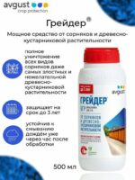Гербицид Грейдер AVGUST 500 мл (32769) – системный гербицид сплошного действия для уничтожения всех видов нежелательной травянистой и древесной растительности. Применяется на землях несельскохозяйственного назначения.В течение первых суток после обработки прекращается рост и развитие растений. Видимые признаки повреждений проявляются через 7-14 дней в виде обесцвечивания и побурения точек роста. Полная гибель травянистой растительности наступает через 1-2 месяца, древесно-кустарниковой – через 2-3 месяца.• Длительный период защитного действия – в течение не менее одного года с момента обработки.• Действует на надземную часть сорняков и их корневую систему.• Устойчив к смыванию дождём уже через час после обработки.• Низкая токсичность, отсутствие миграции в почве.