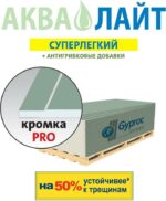 Гипсокартон влагостойкий ГСП Н2 GYPROC Лайт Аква 2500х1200х9,5 мм (88636) представляет собой сверхлегкий влагостойкий материал, который изготовлен с использованием антигрибковых добавок и предназначен для монтажа потолков в санузлах и других помещениях с высокой влажностью. Благодаря своим свойствам, позволяет воплотить любое дизайнерское решение независимо от зоны применения. Основными преимуществами данного продукта является лёгкий вес, гладкая поверхность и устойчивость к влаге. Гипсовая плита влагостойкая – экологически чистый отделочный материал. Он состоит из гипсового сердечника со специальными добавками-гидрофобизаторами, облицованного особым картоном. Благодаря уникальной утоненной кромке PRO глубина выемки, которая образуется в месте соединения плит, составляет всего 1-1,5 мм. В этом случае для заделки стыка требуется минимальное количество шпаклевки, которая равномерным слоем распределяется по всему шву.