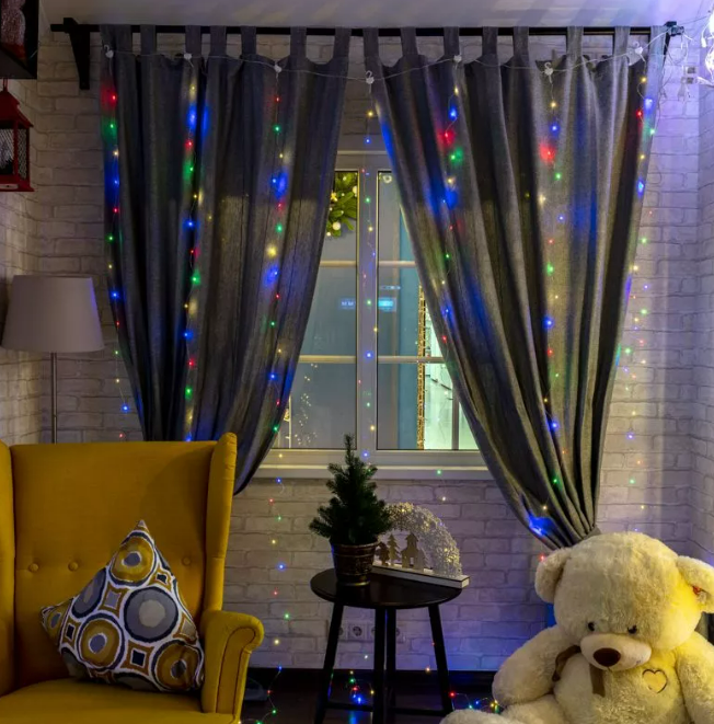 Гирлянду легко повесить на штору, тюль или карниз при помощи пластиковых крючков.