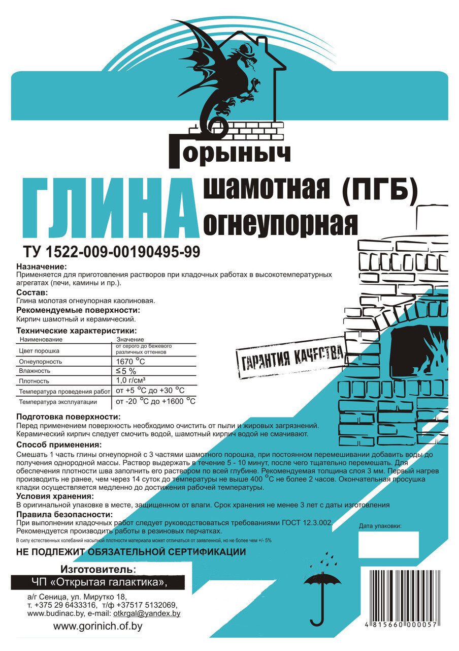 Смесь кладочная ГОРЫНЫЧ Глина шамотная огнеупорная 15 кг применяется для приготовления растворов при кладочных и обмуровочных работах в высокотемпературных агрегатах (печах, каминах, барбекю и пр.) с температурой эксплуатации до 1600 градусов Цельсия.