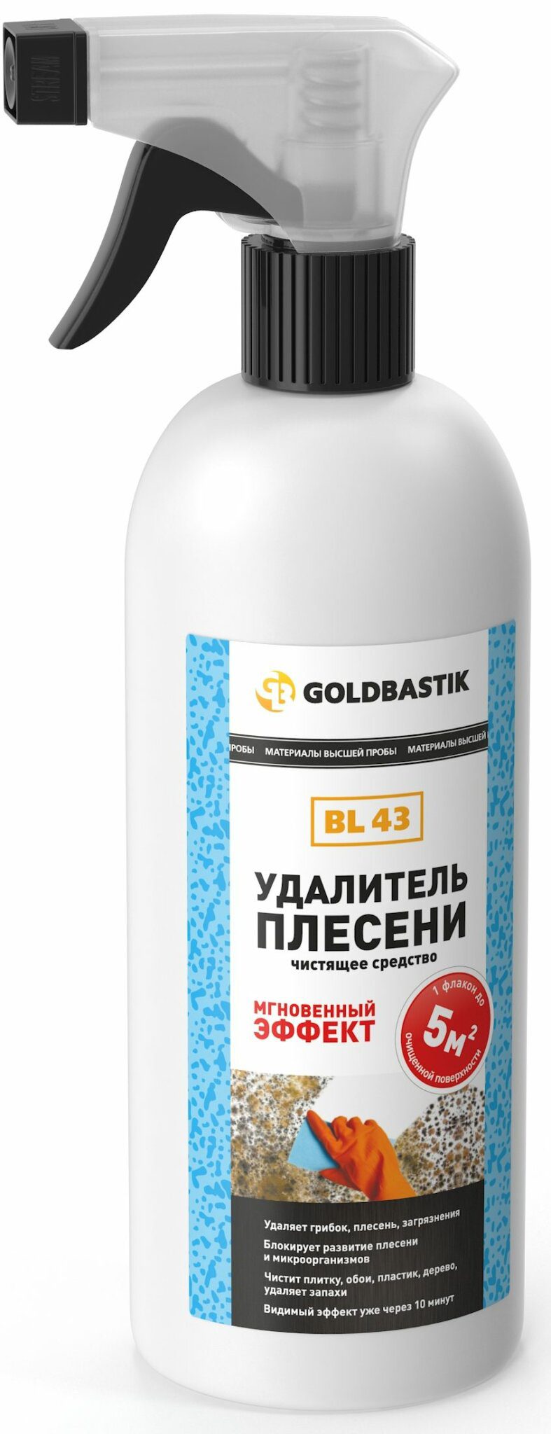 Антисептик GOLDBASTIK Удалитель плесени 0,5 л (BL 43) – эффективное средство для удаления плесени, грибка, мха, водорослей, слизистых, мыльных и других глубоко въевшихся загрязнений с керамической плитки и стыков, обоев, пластика, дерева, бетона, гипсокартона, окрашенных поверхностей, искусственного и натурального камня, цоколя, бордюров, памятников и т. п. Обладает дезинфицирующим эффектом. Применяется для очистки внутренних и наружных стен зданий, ванных комнат, душевых кабин, эффективно очищает деревянные поверхности в банях и саунах, удаляет плесень и запахи в подвальных помещениях. Особенность — обладает сильным окислительным эффектом и дает видимый результат уже через 10 минут. Быстро разлагается без образования вредных веществ.