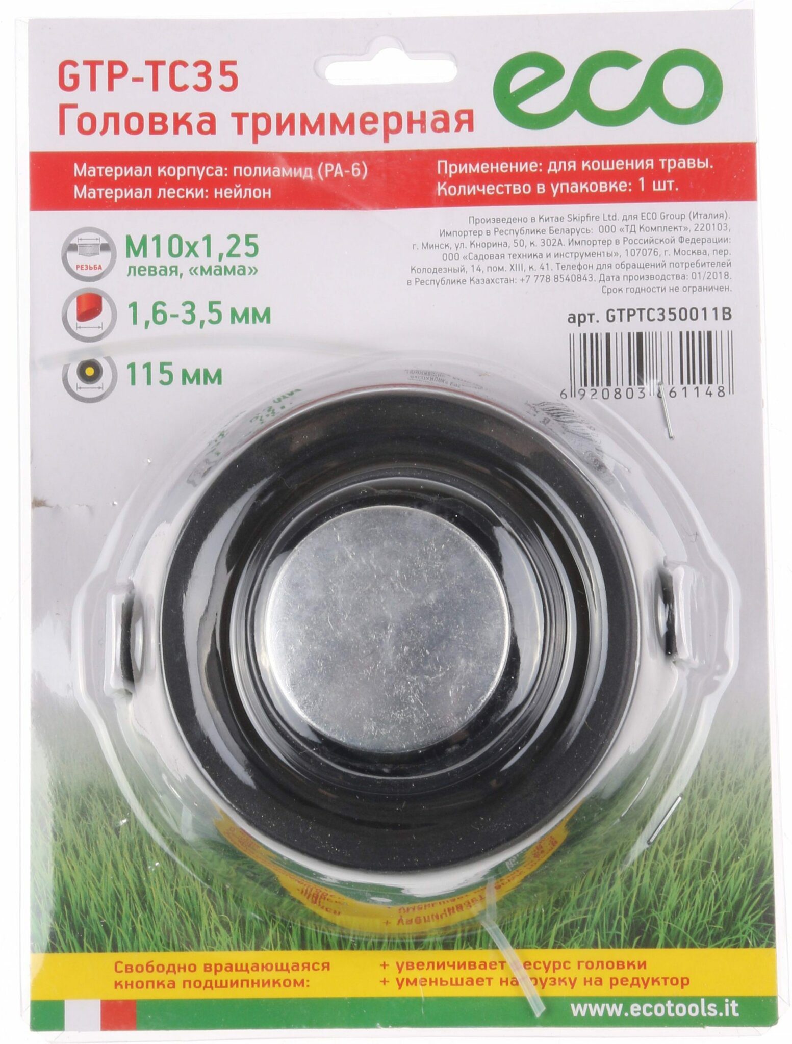 Головка триммерная ECO GTP-TC35 леска d 2,4 мм (GTPTC350011B) имеет полуавтоматический выпуск лески (при ударе о землю в процессе работы). Заправка лески осуществляется без разборки корпуса катушки. Корпус изготовлен из высокопрочного пластика. Поставляется в блистерной упаковке.