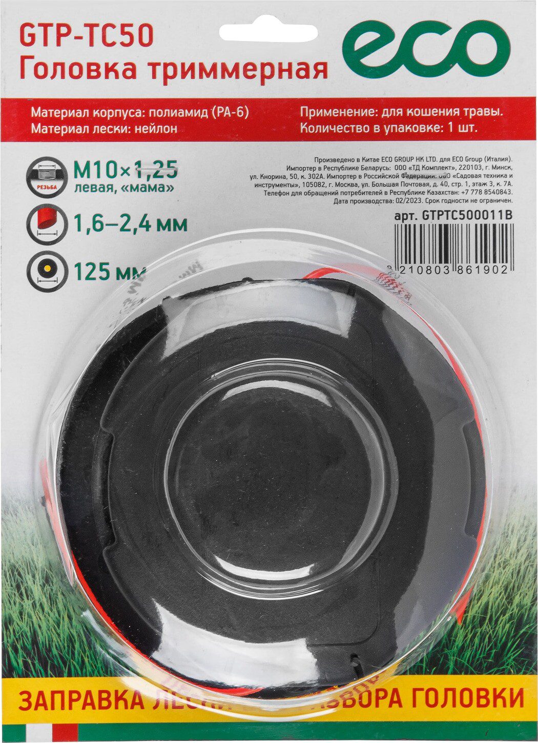 Головка триммерная ECO GTP-TC50 (GTPTC500011B) имеет полуавтоматический выпуск лески (при ударе о землю в процесе работы). Заправка лески лёгкая – без разборки корпуса катушки. Высокопрочный пластиковый корпус. Свободно вращающаяся кнопка с подшипником уменьшает износ головки и редуктора мотокосы.