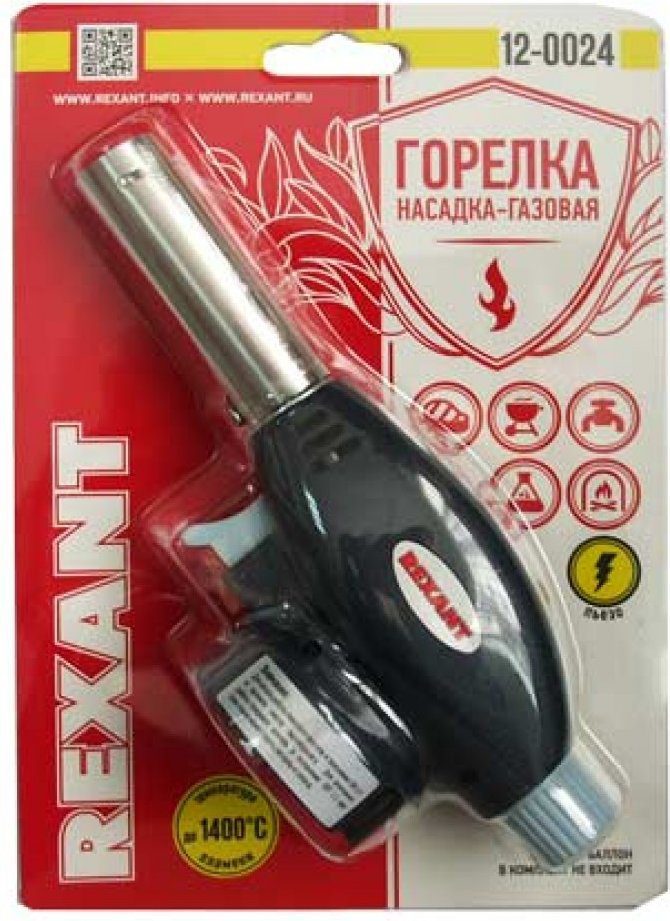 Горелка-насадка газовая REXANT GT-24 (12-0024) – газовая горелка-насадка с пьезоподжигом. Благодаря наличию пьезоподжига, такой горелкой удобно пользоваться одной рукой. Рекомендуется для работы с термоусаживаемыми трубками, перчатками, муфтами; для плавления и сварки изделий из пластиков и стекла; удаления краски; обработки поверхностей на производстве и в лабораторных условиях; для разморозки замков, водопроводных труб, продуктов; для копчения продуктов или карамелизации десертов; для украшения процесса подачи блюд; для работ в саду и огороде, для быстрого и экологичного поджига дров, угля. Диаметр сопла: 20 мм. Время прогрева: 90 секунд. Тип газового баллона: ТВ-220 (цанговый). Топливо: смесь газа бутанизобутан.