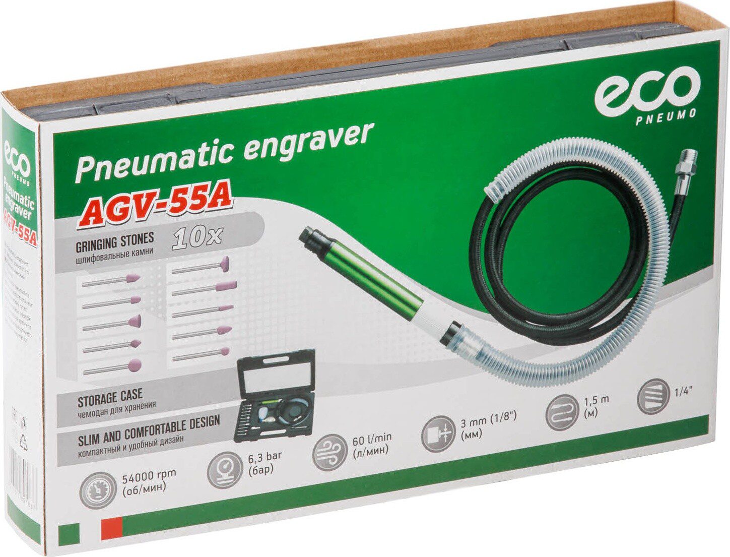 Гравер пневматический ECO AGV-55A подходит для шлифовки, полировки и удаления заусенцев. Цанговый патрон: 3 мм (1/8″). Пластмассовый чемодан для удобства переноски.
