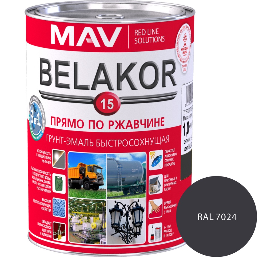 Грунт-эмаль алкидная BELAKOR 15 прямо по ржавчине 3 в 1 RAL 7024 графитовый 10 л предназначена для промышленной покраски стальных и чугунных поверхностей транспортных средств (дорожная и сельхозтехника, машины, механизмы), металлоконструкций (несущие элементы сооружений, стеллажи, ограждения и др.), оборудования (станки, детали и узлы), которые эксплуатируются в атмосферных условиях, а также внутри помещений (металлическая мебель, двери, лестничные перила, за исключением полов). Алкидная грунт-эмаль Belakor 15 сочетает в себе свойства антикоррозионной грунтовки и декоративной эмали, что позволяет упростить процесс окрашивания.