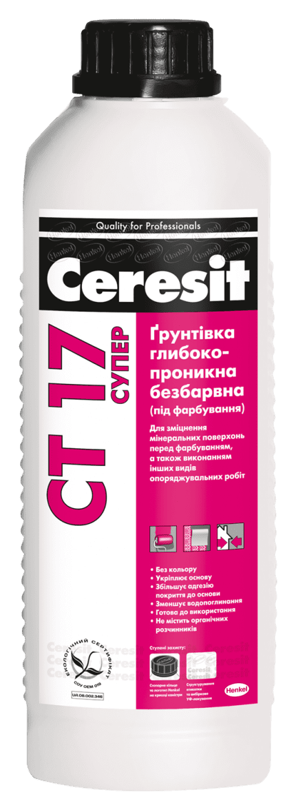 Грунтовка CERESIT CT 17 Super Grunt концентрат бесцветный 2 л применяется для поверхностного укрепления и пропитки пористых, непрочных и сильновпитывающих минеральных оснований (легкий бетон, штукатурка, гипсовые и кирпичные поверхности) внутри и снаружи зданий перед укладкой керамической плитки, приклеиванием теплоизоляционных плит, шпатлеванием, оштукатуриванием, окраской, устройством самонивелирующихся цементных покрытий на полах. Ceresit CT 17 SuperGrunt особенно рекомендуется для грунтования ангидритовых, гипсовых, ячеисто-бетонных оснований. Грунтовка проникает в основание и связывает зерна наполнителя, однако при этом не увеличивает прочностные параметры по всему сечению основания.