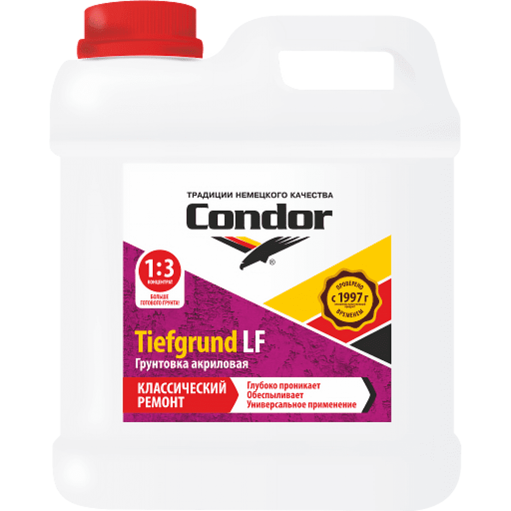 Грунтовка CONDOR Tiefgrund LF концентрат 2 кг предназначена для грунтования пористых минеральных (шпатлевка, штукатурка, гипсокартон, кирпич, бетон и др.) и деревянных поверхностей под покраску, оклейку обоями, облицовку керамической плиткой, под нанесение декоративной штукатурки, для наружных и внутренних работ. Концентрат 1:3. Идеальна под обои и перед укладкой напольных покрытий (линолеум, ламинат и т.д.). Поверхность необходимо очистить от непрочных старых, не впитывающих влагу покрытий, грязи, пыли, жира.