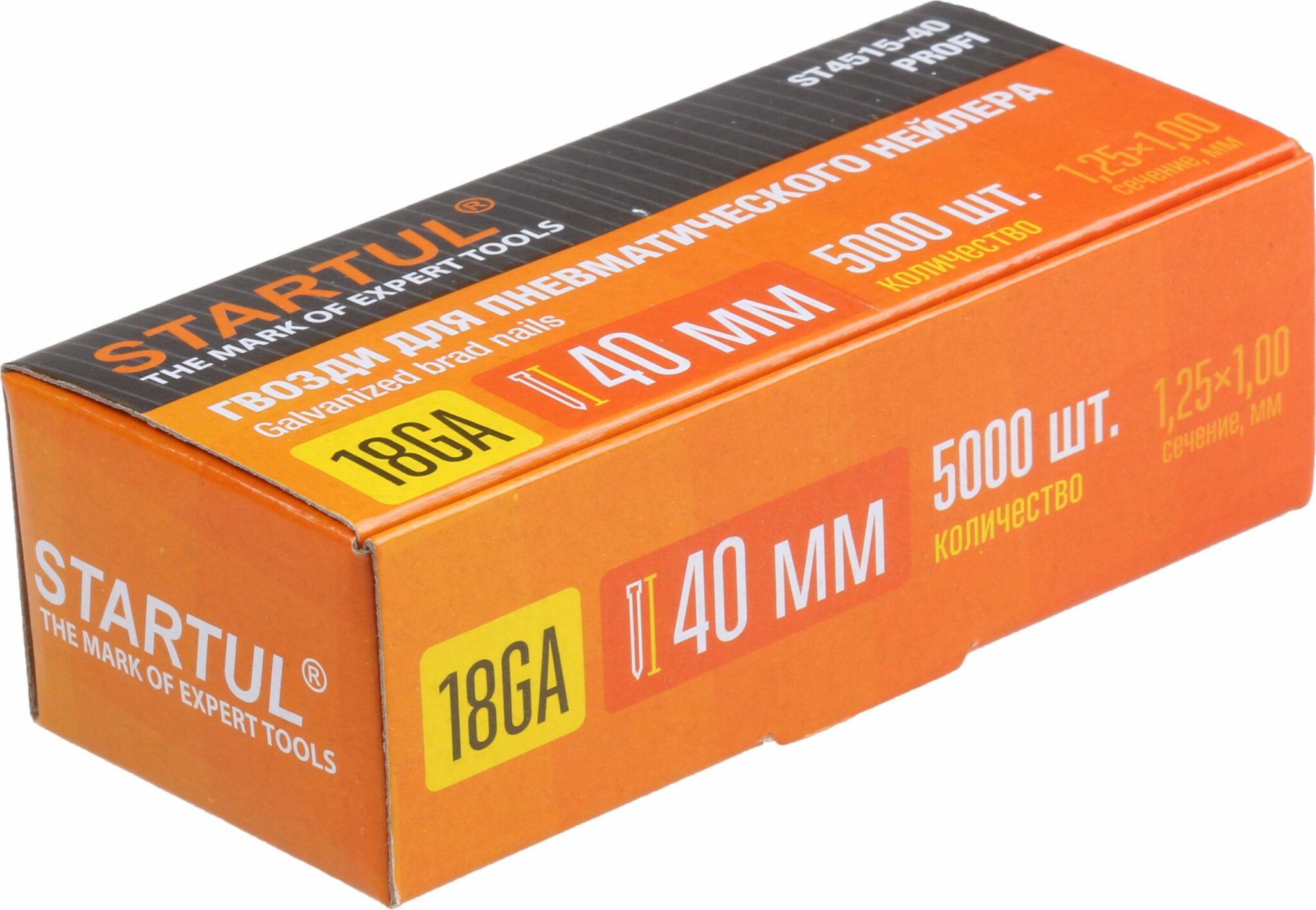Гвозди 40 мм тип 18GA 5000 штук STARTUL Profi (ST4515-40) предназначены для крепления материала к поверхностям с помощью пневматического нейлера. Изготовлены из закаленной углеродистой стали Q235, имеют оцинкованнное покрытие. Сечение 1,25х1,00 мм. Для пневмостеплеров ECO ASL-50N, FUBAG F50, FUBAG SN4050, MATRIX 57410, MATRIX 57426, MATRIX 57427, MATRIX 57428, PATRIOT ANG 210R, SUMAKE F18/50, КАЛИБР ПГСЗ-18.