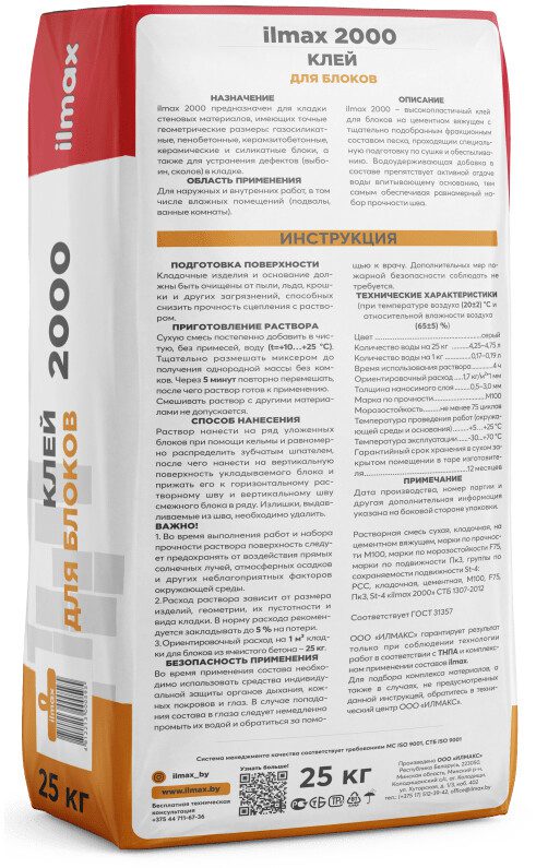 Смесь кладочная ILMAX 2000 25 кг предназначена для укладки блоков из ячеистого бетона (в том числе газосиликатных), керамзитобетонных и пенобетонных блоков и других штучных стеновых материалов; а также для устранения дефектов (неровности, выбоины, сколы) в них.Марка по подвижности Пк3, группа по сохраняемости подвижности St-4:РСС.
