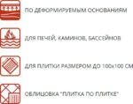 | Наружное применение, Внутреннее применение, Теплый пол, Бассейн, Камины / печи, Полы, Стены | |