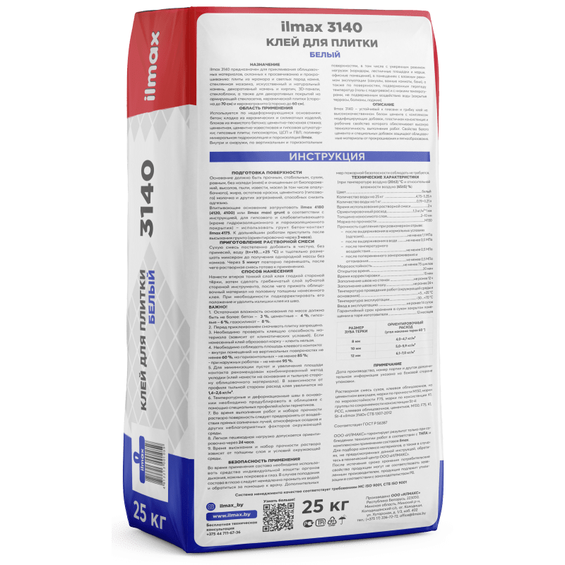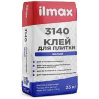 Клей для плитки ILMAX 3140 25 кг предназначен для приклеивания: плитки из натурального и искусственного камня, в том числе мраморной; стеклянной плитки (Грес); мозаики; прозрачной, полупрозрачной, склонной к изменению цвета (прокрашиванию) плитки; керамической глазурованной и неглазурованной плитки, клинкерной плитки; плиток с водопоглощением менее 1%, в том числе, керамогранитных плиток (Грес); АМК плитки внутри и снаружи зданий. ilmax 3140 может применяться для приклеивания плитки размером до 60х60 см. Используется на жестких (недеформируемых) впитывающих основаниях из следующих материалов: бетон; цементные и цементно-известковые штукатурки; кирпич и блоки из ячеистого бетона; цементные стяжки, в том числе полы с подогревом.Марка по консистенции К1, группа по сохраняемости консистенции St-4: РСС.