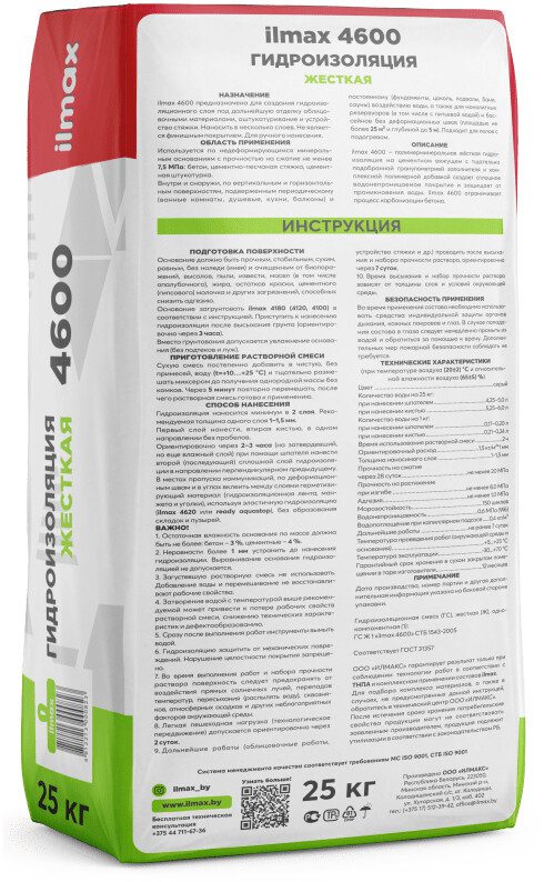 Гидроизоляция ILMAX 4600 серая 25 кг предназначена для устройства водонепроницаемых покрытий на недеформирующихся минеральных основаниях внутри и снаружи зданий. Применяется в помещениях, подверженных периодическому воздействию воды: ванные и санузлы, душевые, сауны, бани. А также на полах и стенах зданий и сооружений, находящихся в непосредственном контакте с водой: фундаменты, цокольные и подвальные помещения, балконы, монолитные резервуары с водой, монолитные бассейны (площадью до 20…25 м2 и глубиной до 5 метров), гидротехнические и очистные сооружения, градирни. Ограничивает процесс карбонизации бетона и является надежной антикоррозионной защитой для бетона и железобетона. Гидроизоляцию ilmax 4600 следует защитить облицовкой (использовать эластичный клей ilmax 3130), штукатуркой или стяжкой от механических повреждений.