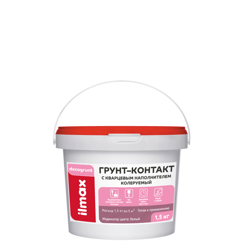 Грунтовка ILMAX Грунтовка-контакт с кварцевым наполнителем колеруемая 1,5 кг (90764) предназначена для предварительной обработки основания и создания шероховатой поверхности перед нанесением тонкослойных декоративных штукатурок и стартовых шпатлевок на минеральном и акриловом вяжущем, а также для консервации фасадов зданий на зимний период и под дальнейшую окраску. Обеспечивает высокоадгезионный контактный слой и равномерное снижение водопоглощения основания. Шероховатая поверхность облегчает нанесение декоративных штукатурок. Применение грунт-контакта увеличивает рабочее время наносимых материалов, что предотвращает быстрое их высыхание и позволяет равномерно набрать прочность. Высокая укрывистость грунта делает основание однородным по цвету, что улучшает впоследствии качество декоративной поверхности.Для ручного и механизированного нанесения. Для внутренних и наружных работ на вертикальных и горизонтальных (потолочных) поверхностях.