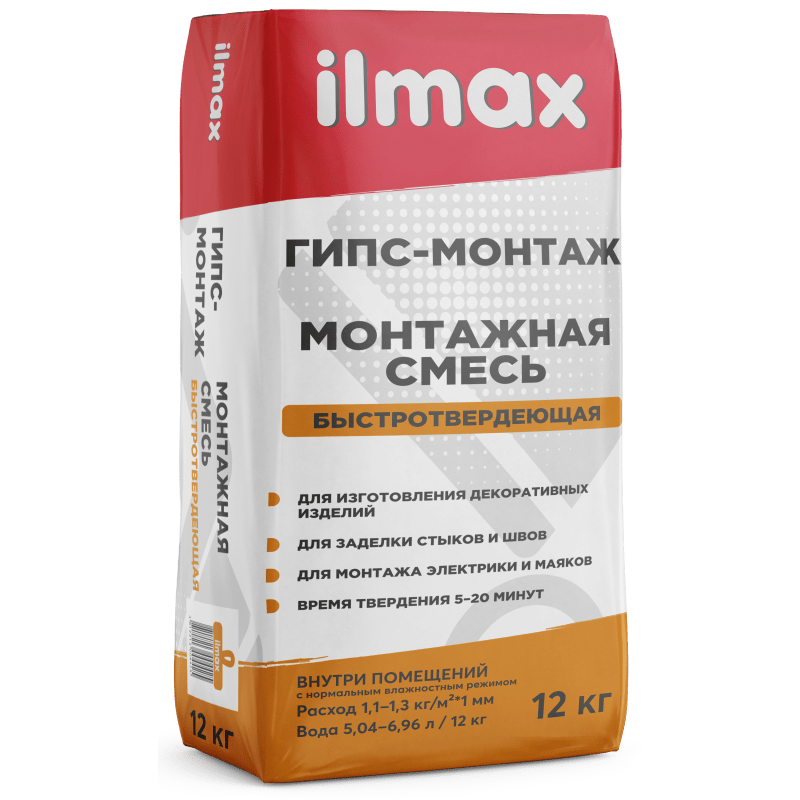ilmax гипс-монтаж предназначена для изготовления гипсовых строительных, декоративных изделий и при ремонтных работах: фиксации электрических розеток; крепления электропроводки; штукатурных маяков под гипсовые штукатурки; заполнения штраб, стыков, трещин, выбоин; для выравнивания поверхностей и устройства скруглений. Для ручного нанесения.
