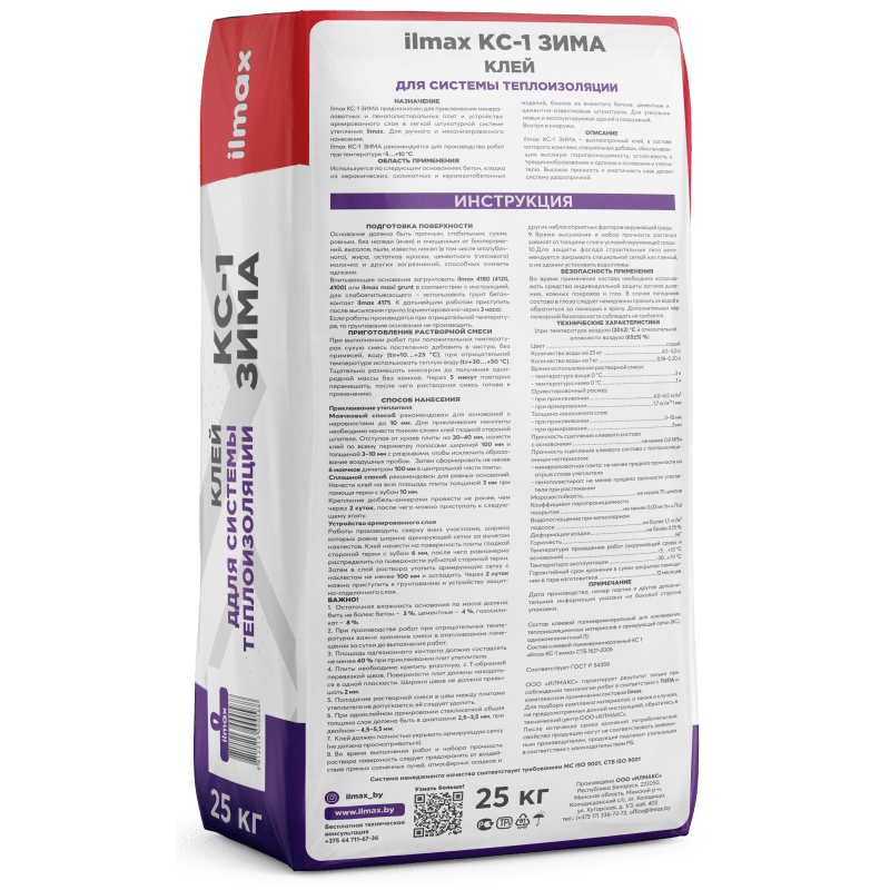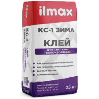 Клей для теплоизоляции ILMAX КС-1 зима 25 кг предназначен для создания армированного слоя, а также для приклеивания теплоизоляционных плит из минеральной ваты или пенополистирола в легких штукатурных системах утепления. Используется при утеплении новых и эксплуатируемых зданий на основаниях из кирпича, блоков, бетона, цементных и цементно-известковых штукатурок и других минеральных основаниях. Имеет высокий коэффициент паропроницаемости. Рекомендуется для производства работ при низкой температуре.Ilmax KC-1 ЗИМА является составной частью легкой штукатурной системы утепления зданий “Илмакс”.