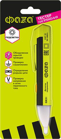 Индикатор напряжения ФАЗА GK51 (4895205000599) – бесконтактный тестер переменного напряжения, позволяющий определить наличие напряжения через изоляцию с помощью микроволнового детектора, определить разрыв цепи, обнаружить скрытую проводку, провести проверку заземления. Работает от 2-х батареек типа ААА, которая не входит в комплект.