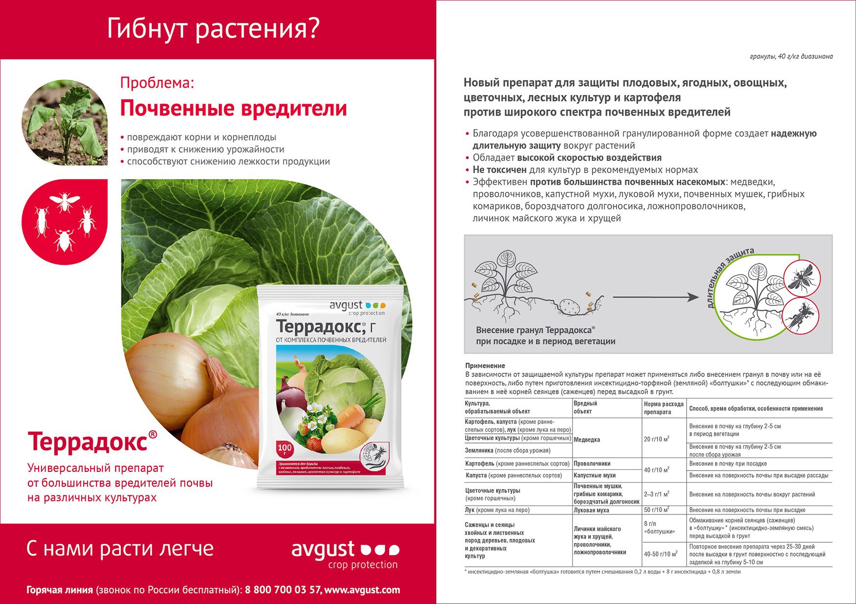 Инсектицид Террадокс AVGUST 200 г – универсальный препарат от комплекса почвенных вредителей.Используется Террадокс различными способами, в зависимости от культуры. При посадке картофеля, капустной рассады, лука, цветочных культур гранулы препарата вносят в почву или на ее поверхность. При пересадке саженцев обмакивают корни в приготовленную инсектицидно-земляную болтушку. Террадокс обладает длительной защитой, высокой скоростью воздействия и нетоксичен для культур в рекомендуемых нормах. Эффективность препарата отмечена против большинства почвенных насекомых: медведки, капустных мух, почвенных мушек, грибных комариков, бороздчатого долгоносика, луковой мухи, проволочников, ложнопроволочников, личинок майского жука, хрущей и др. Даже если Вам не удается определить, кто именно портит урожай, применив Террадокс, можно быть спокойным: он без проблем справится с незваными гостями на Вашем приусадебном участке.При соприкосновении с гранулами или почвой вокруг них вредители погибают. Защитное действие от медведки и майского жука сохраняется на две недели, а от проволочников, капустных и луковых мух на целый сезон. Применять Террадокс нужно согласно инструкции. Внесение гранул препарата и обработка раствором желательно в утренние (до 10:00) и вечерние (после 18:00) часы. После использования препарата обычно должно пройти некоторое время до сбора урожая.