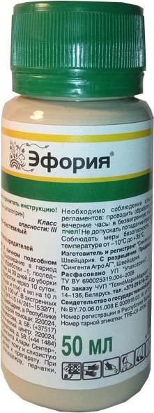 Инсектицид Эфория КС АГРОМАРКЕТ 50 мл – это комбинированный контактно-системный инсектицид, предназначенный для защиты картофеля от комплекса вредителей.Скорость воздействия средства для защиты растений от вредителей: насекомые перестают питаться через 10-20 минут после обработки инсектицидом Эфория®, КС. Полная гибель насекомых происходит через 2-4 часа.Период защитного действия: 2-4 недели в зависимости от погодных условий, сроков применения и вида вредителей.Препаративная форма: концентрат суспензии.