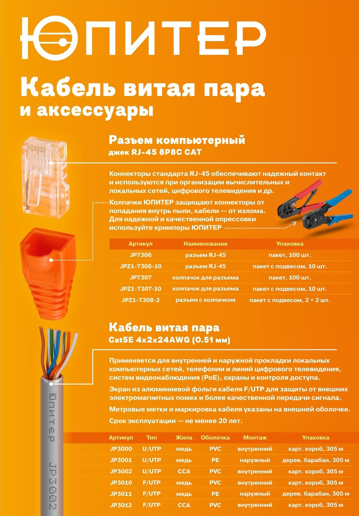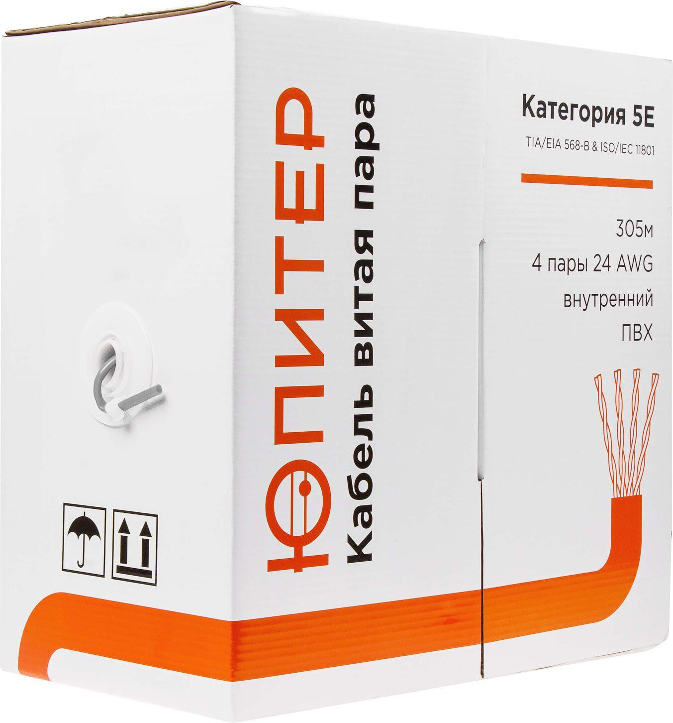 Кабель витая пара F/UTP Cat5E 4х2х24AWG ЮПИТЕР медь в ПВХ оболочке 305 м (JP3010) изготовлен с соблюдением всех стандартов. Четырехпарный кабель имеет следующую конструкцию: проводник — сплошная медная жила диаметром 24AWG (0,51мм). Два проводника составляют одну витую пару, в целом же, кабель состоит из четырех пар, скрученных с различным, специально подобранным шагом. Для более качественной передачи сигнала кабель имеет под внешней оболочкой общий экран в виде алюминиевой фольги, что обеспечивает дополнительную защиту от внешних электромагнитных помех. На кабеле нанесена маркировка с указанием категории кабеля, количества пар, типа и диаметра медного проводника, а также мерные м.