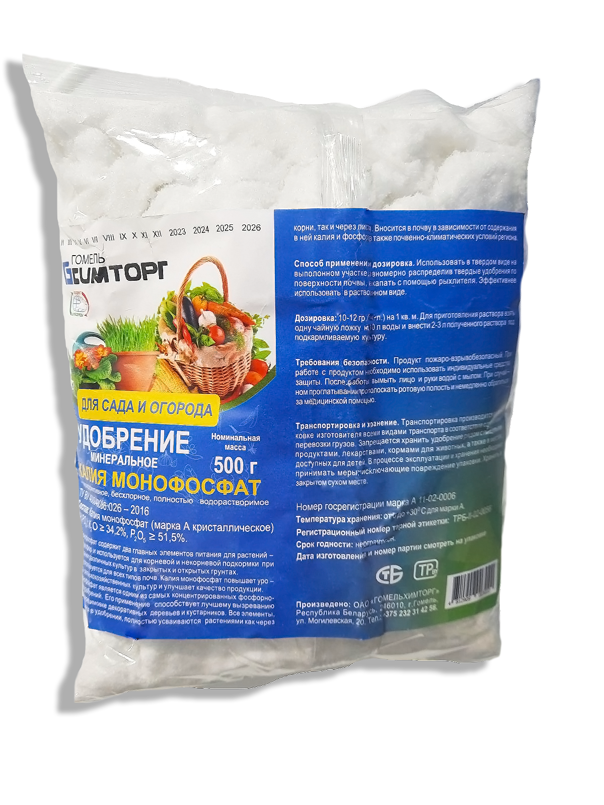 Калия монофосфат- высокоэффективное бесхлорное удобрение, содержащее в качестве питательных элементов фосфор и калий. Удобрение применяется для питания растений в защищённом и открытом грунте при внесении с поливной водой, а также для внекорневых подкормок. Монофосфат калия – полностью водорастворимое удобрение, совместим с большинством применяемых удобрений и пестицидов; не содержит вредных примесей.