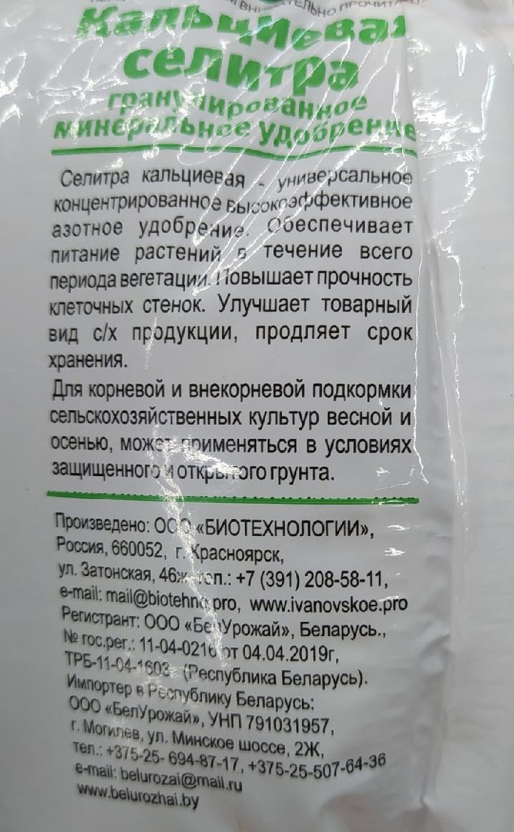 Удобрение минеральное БИОТЕХНОЛОГИИ Садовые рецепты Кальциевая Селитра 1 кг ‒ универсальное концентрированное высокоэффективное азотное удобрение. Обеспечивает питание растений в течение всего периода вегетации. Повышает прочность клеточных стенок. Улучшает товарный вид с/х продукции, продляет строк хранения. Для корневой и внекорневой подкормки сельскохозяйственных культур весной и осенью, может применяться в условиях защищенного и открытого грунта.Эффект применения:- стимулирует формирование корневой системы;- повышает урожайность;- повышает адаптацию культур к болезням и погоде.