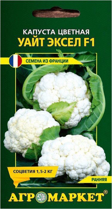 Семена капусты цветной Уайт эксел F1 АГРОМАРКЕТ 15 штук – это капуста раннего срока созревания (65-70 дней после высадки рассады). Хорошо подходит для выращивания как в ранней культуре весной (в отапливаемых теплицах), так и во втором обороте для уборки осенью. До созревания соцветие хорошо прикрыто листьями, что защищает головку от солнца. Вес соцветия составляет 1,5-2 кг, куполообразной формы.