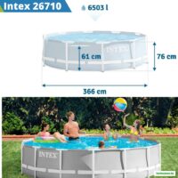 Бассейн INTEX Prism Frame 26710 (366х76) имеет усиленный каркас. Сборный каркасный бассейн серии Intex Prism Frame круглой формы. Запатентованная технология SUPER-TOUGH обеспечивает надежность и долговечность бассейна. Стенки бассейна сделаны из трех отдельных особо прочных слоев: два слоя плотного винила и один – полиэстр для особой прочности. Поддержанию формы бассейна Prism Frame способствует лента из полипропилена, «опоясывающая» весь бассейн. Также прочность бассейна Prism Frame обуславливается его стальным каркасом, благодаря которому бассейн выдерживает большие нагрузки, в нем одновременно могут купаться несколько человек. Не требует подготовки грунта, насыпке песка и т.п., все, что нужно, это плоская, горизонтальная площадка.