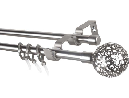 Карниз для штор настенный двухрядный Лайт Ажур Сатин 3,0 м — металлический карниз с простым лаконичным дизайном. Чистота линий и дизайнерский минимализм модели станет прекрасной основой для оформления оконного проема в любом стилистическом направлении, от классики до модерна и прованса. Наконечники выполнены в виде простых заглушек с правильной формой низкого цилиндра с аккуратными краями, что дает возможность смещать визуальный акцент на шторы. Можно выбирать любые по качеству занавески — броские с богатой расцветкой или сдержанные однотонные. Базу карниза составляет металлическая труба с гладкой поверхностью. Штанга легкая, но при этом прочная; толщина металла — 0,6 мм. Изделие надежно фиксируется на стену с помощью кронштейнов. В комплект поставки входят бесшумные кольца с крючками (10 шт. на метр погонный), кронштейны, фурнитура для крепления кронштейнов.