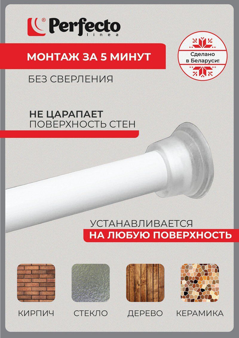 Карниз для ванной PERFECTO LINEA 2,0 м (36-020101) устанавливается в ванной комнате с расстоянием между стенами 110-200 см. Диметр трубок карниза: 22 и 25 мм.