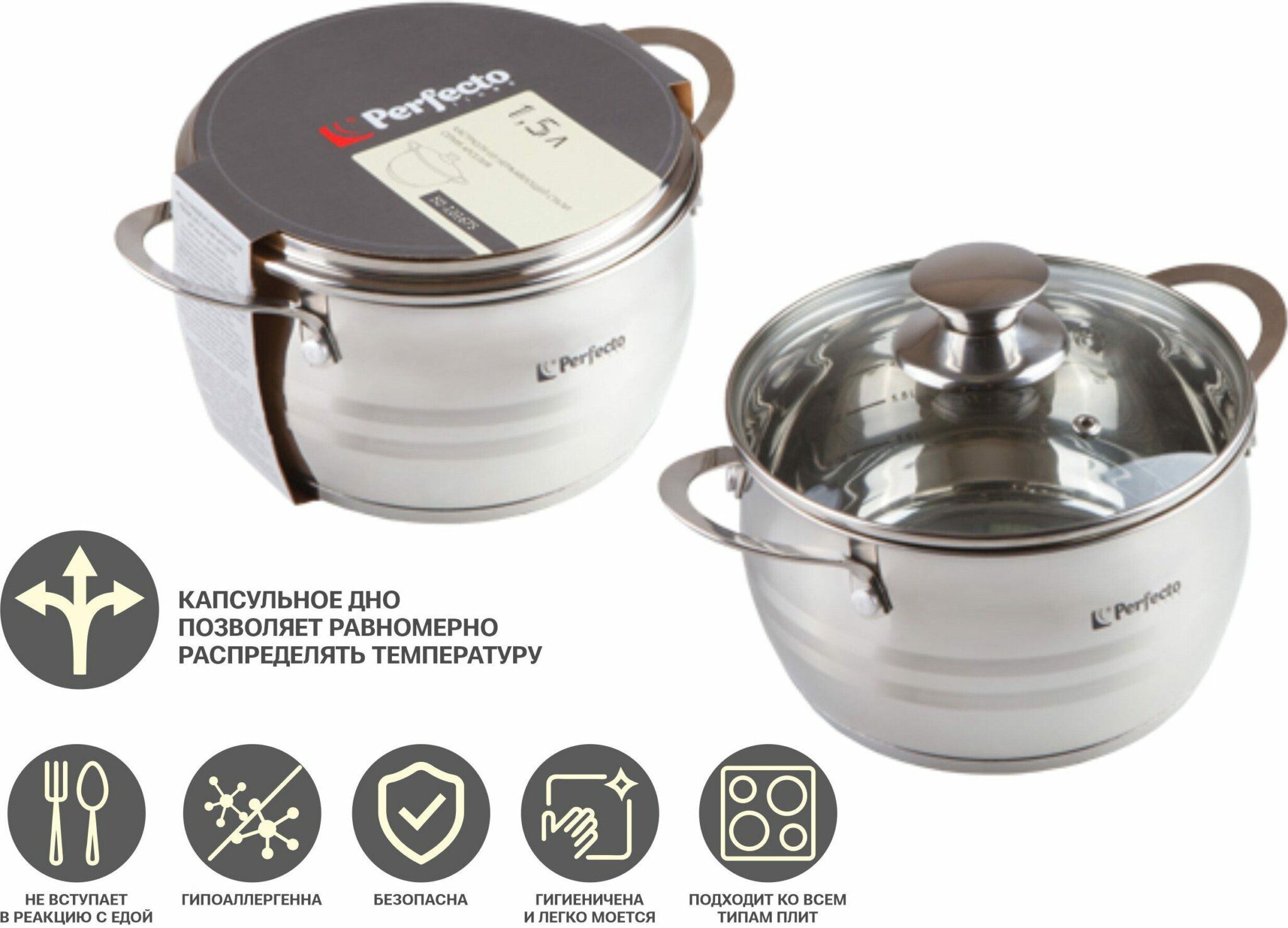 Кастрюля из нержавеющей стали 1,5 л PERFECTO LINEA Arcelia (50-101675) предназначена для приготовления пищи, хранения и переноски готовой еды. Посуда из нержавеющей стали не вступает в реакцию с едой, гипоаллергенна, безопасна, легко моется. Кастрюля подходит для всех типов плит. Капсульное дно позволяет равномерно распределять температуру.