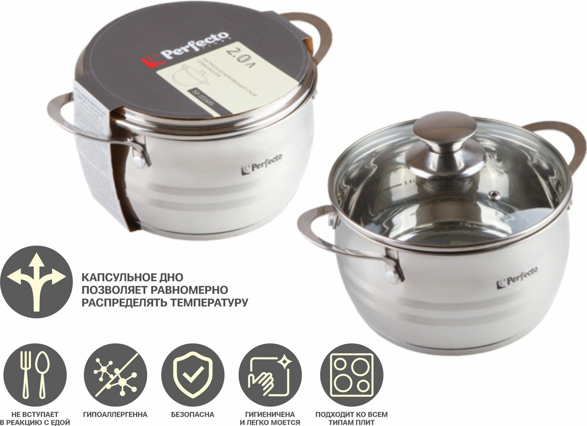 Кастрюля из нержавеющей стали 2 л PERFECTO LINEA Arcelia (50-101695) предназначена для приготовления пищи, хранения и переноски готовой еды. Посуда из нержавеющей стали не вступает в реакцию с едой, гипоаллергенна, безопасна, легко моется. Кастрюля подходит для всех типов плит. Капсульное дно позволяет равномерно распределять температуру.