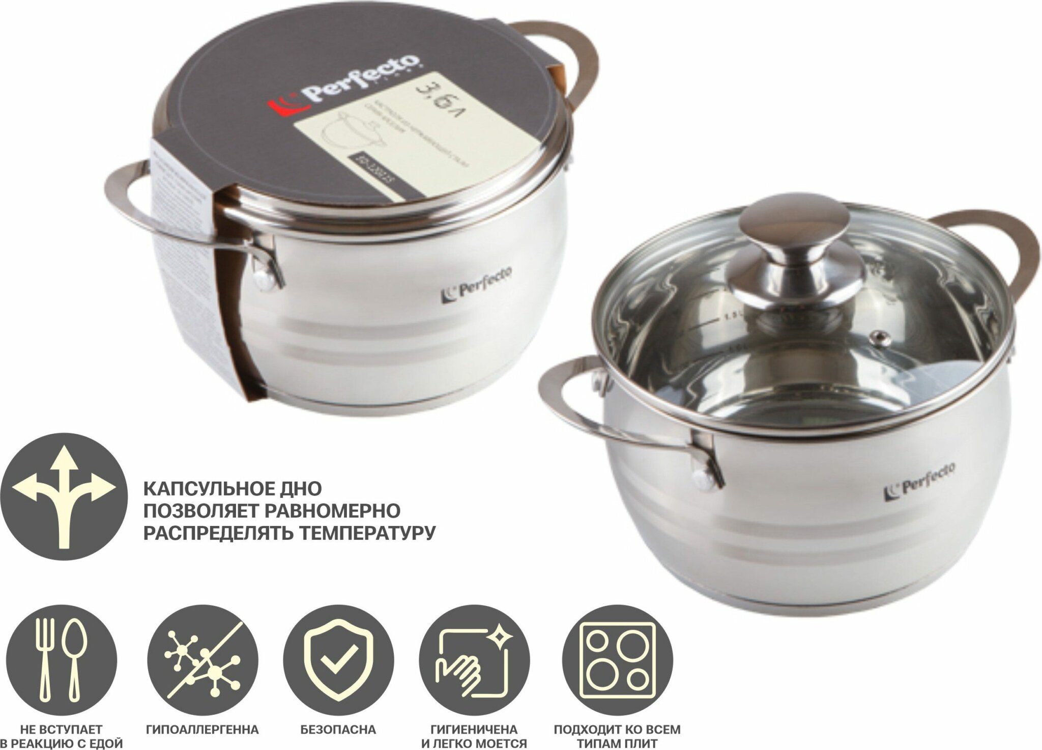 Кастрюля из нержавеющей стали 3,1 л PERFECTO LINEA Arcelia (50-120100) предназначена для приготовления пищи, хранения и переноски готовой еды. Посуда из нержавеющей стали не вступает в реакцию с едой, гипоаллергенна, безопасна, легко моется. Кастрюля подходит для всех типов плит. Капсульное дно позволяет равномерно распределять температуру.