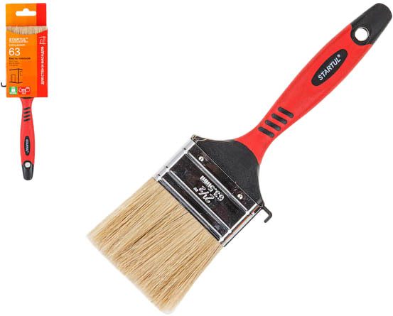 Кисть плоская STARTUL Profi 63 мм (ST0114-63) используется для выполнения различных внутренних и наружных малярных работ на плоских поверхностях. Используется со всеми типами лакокрасочных материалов (ЛКМ), применяются преимущественно при окрашивании лакокрасочными материалами на масляной основе и густыми лаками, олифой и эмалями. Натуральная светлая щетина двойной выварки. Устойчива к сильным растворителям, обладает хорошей краскоотдачей, равномерное распределение краски по окрашиваемой поверхности. Имеет определенные ограничения при применении ЛКМ на водной основе, так как натуральная щетина впитывает в себя воду. Бандаж металлический с антикоррозийной обработкой. Двухкомпонентная эргономичная ручка, позволяющая выполнять длительные малярные работы, с отверстием для подвеса. Для большего удобства кисть дополнена крючком для крепления её на ёмкость с краской.