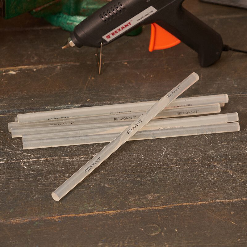 Стержень клеевой 11х270 мм прозрачный REXANT 10 штук (09-1270) при нагревании принимает жидкую форму, а при остывании возвращается в первоначальное твердое состояние, склеивая поверхности. Подходит для соединения и фиксации различных деталей в производстве, строительстве, упаковочной промышленности, ремонтных работах, в домашних условиях, рукоделии, декорировании и в других случаях, где нужно быстрое скрепление. Эффективен при монтаже электрических плат, изготовлении упаковочной и сувенирной продукции, прокладке кабеля сетей фиксированной телефонной связи и сетей передачи данных, при производстве багетов, картинных рам и т. д. Допустимо склеивание между собой в любом сочетании следующих материалов: дерево, пластмасса, картон, бумага, металл, керамика, кожа, ткань и т. д. Температура плавления: около +80°C.