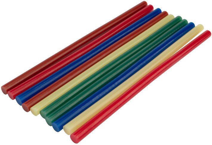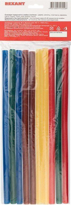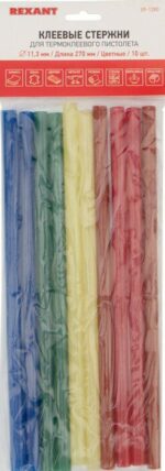 Стержни клеевые 11,3х270 мм цветные REXANT 10 штук (09-1280) предназначен для склеивания разных поверхностей в любом сочетании из дерева, пластмассы, картона, бумаги, металла, керамики и т. д. Для склеивания потребуется всего 40-60 секунд, после чего возможно приступить к использованию склеенных предметов. Достаточно зарядить стержни в клеевой пистолет и поверхности будут склеены всего одним нажатием на курок. Термоклей состоит из смолы ЭВА, которая нетоксична, не выделяет запаха и не содержит растворителей. Это позволит пользоваться термоклеем REXANT даже аллергичным людям.