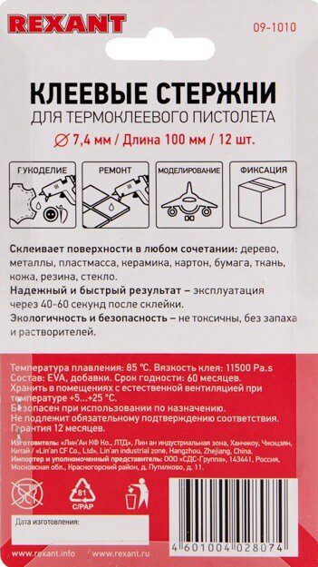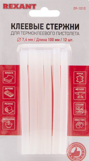 Стержень клеевой 7х100 мм прозрачный REXANT 12 штук (09-1010) – вещество, которое при нагревании принимает жидкую форму, а при остывании возвращается в первоначальное состояние, склеивая поверхности, и становится твердым. Он отлично подходит для соединения или фиксации различных поверхностей (деталей) в производстве, строительстве, упаковочной промышленности, ремонтных работах, в домашних условиях, рукоделии (хобби), декорировании, а также в других случаях, где нужна быстрая фиксация. Он эффективен для монтажа электрических плат, для изготовления упаковочной и сувенирной продукции, при прокладке кабеля сетей фиксированной телефонной связи и сетей передачи данных, при производстве багетов, картинных рам и т.д. Допустимо склеивание между собой в любом сочетании следующих материалов: дерево, пластмасса, картон, бумаг, металл, керамика, кожа, ткань и т. д. Для быстрого нанесения клея-расплава на любые склеиваемые поверхности применяется электрический клеевой пистолет. Чем больше потребляемая мощность пистолета, тем выше производительность выхода расплавленной массы. Диаметр клеевого стержня должен строго соответствовать диаметру применяемых стержней пистолета. Основными компонентами клеевого стержня являются смолы и полимеры. Температура плавления: около +85 °С.