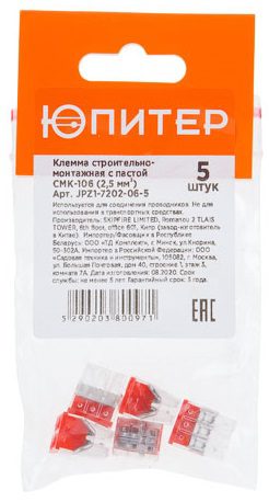 Клемма ЮПИТЕР СМК-106 2,5 мм2 с пастой 5 штук (JPZ1-7202-06-5) используется для соединения медных одножильных и многожильных жестких проводников, для монтажа проводников в распределительной коробке. Фиксация осуществляется с помощью внутреннего зажима, закусывающего провод и не позволяющего ему выйти обратно. Заданное контактное нажатие обеспечивает долговременную стабильность замыкания контакта. Прозрачный корпус позволяет увидеть насколько качественный контакт провода внутрь клеммы. Наличие контактной пасты уменьшает окисление проводов внутри клеммы, что необходимо для соединения алюминиевых проводов и гарантирует долговременный и надежный контакт.