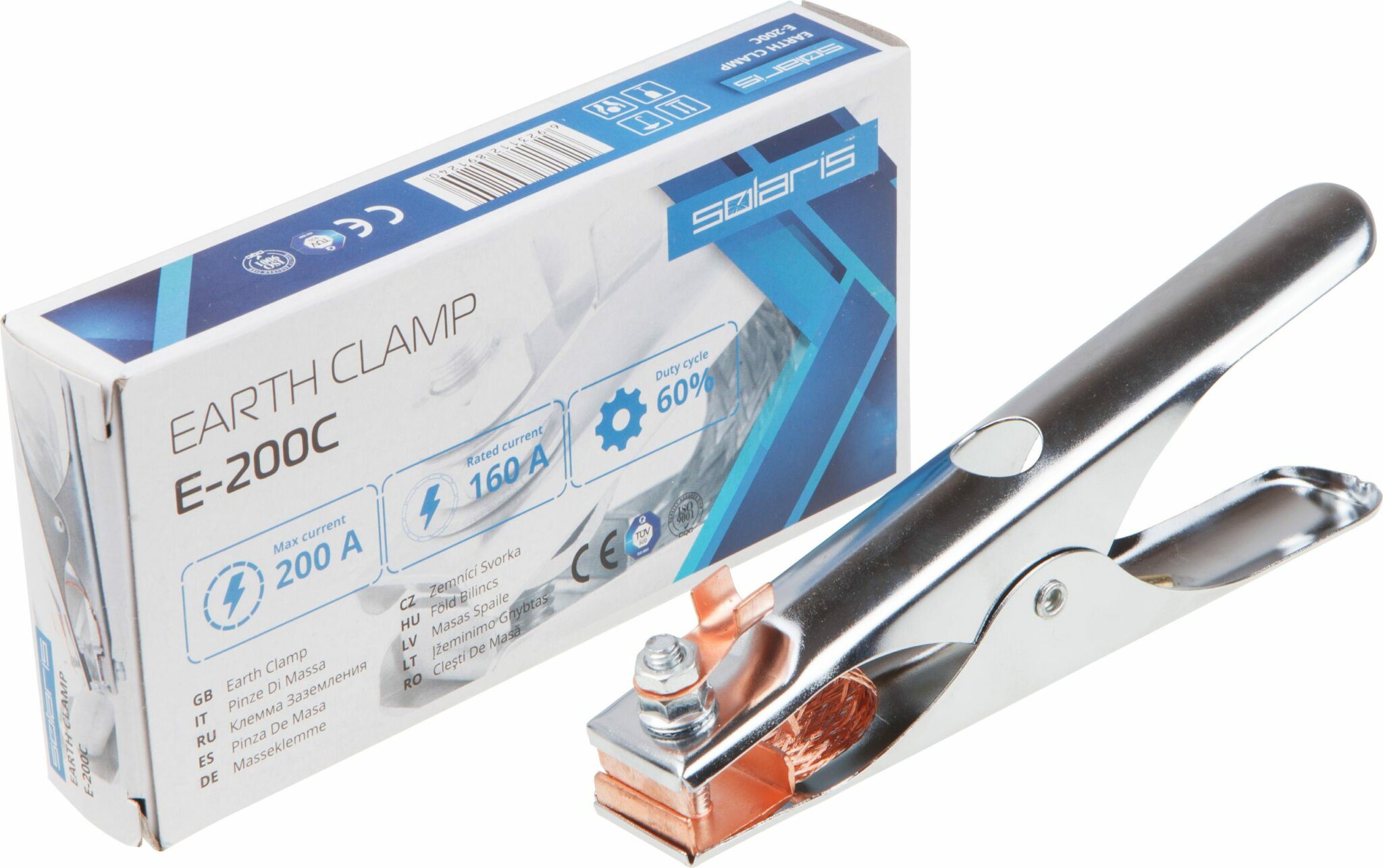 Клемма заземления SOLARIS E-200C способна длительно выдерживать ток силой до 160 А и кратковременно до 200 А, и предназначена для использования в качестве минусового контакта на сварочных аппаратах, работающих при соответствующей силе тока.